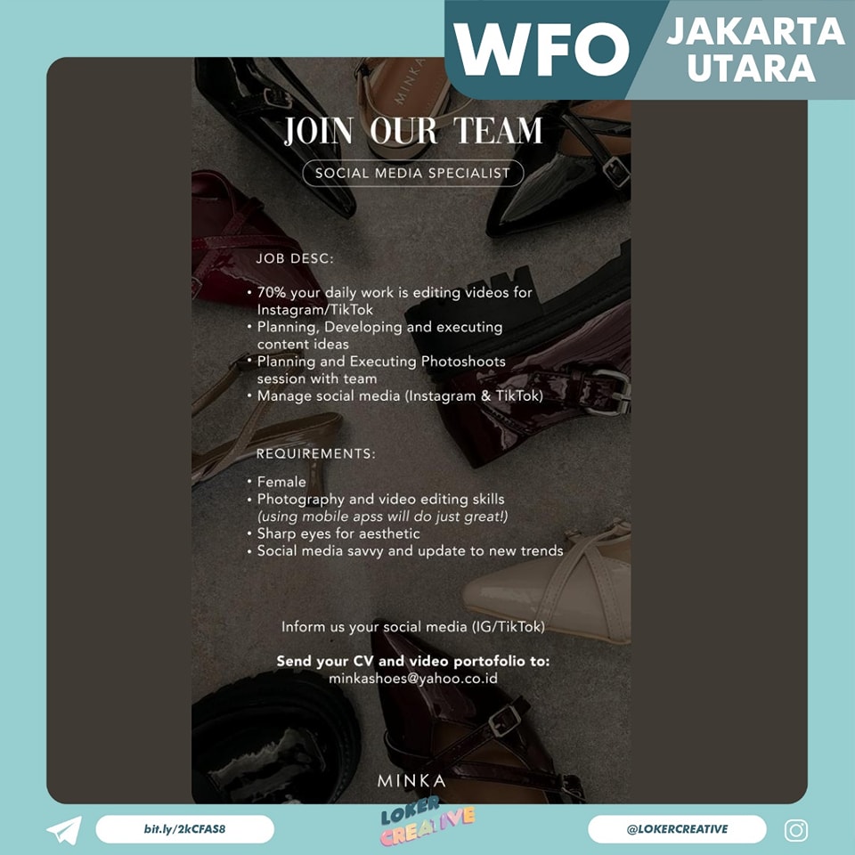 Sunter, Jakarta Utara Fulltime Social Media Specialist Post by Instagram : Kirim CV dan Portfolio ke : minkashoes (